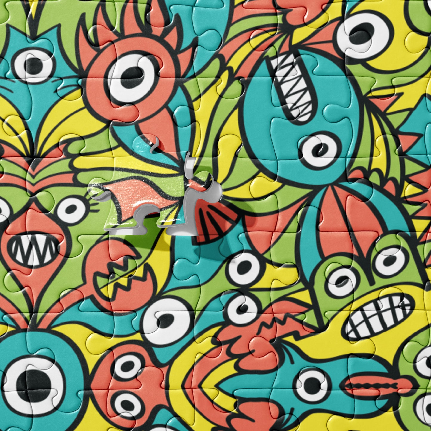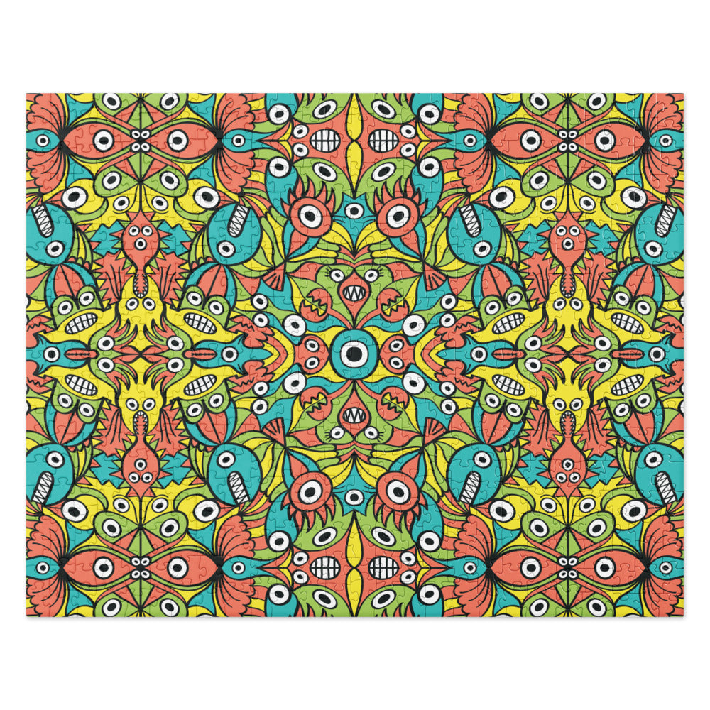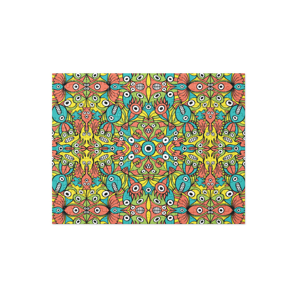 Colorful alien monsters that reproduce to infinity to create an amazing pattern design. They compose a mirrored design using two lines of symmetry. This design features fish, aliens, monsters, crabs, and a wide variety of out-of-this-world creatures.