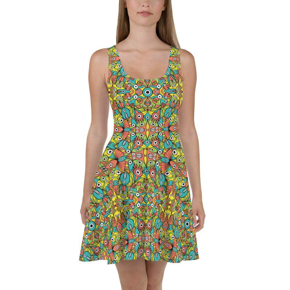 Dress to impress with this sleeveless skater dress! The soft fabric and flared skirt give it an elegant twist that brings out the intricate design with a beautiful vibrancy.• 82% polyester, 18% spandex