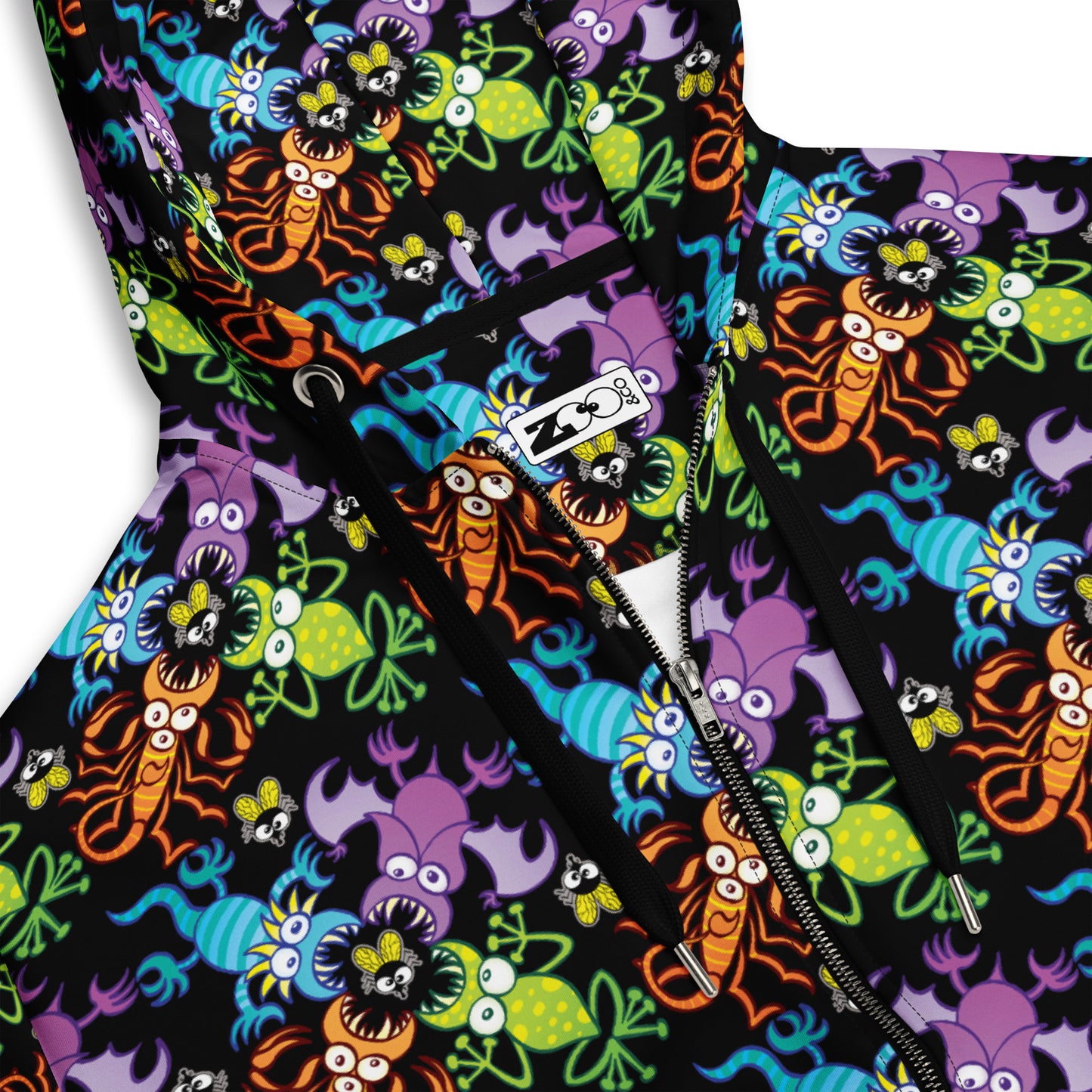 Immerse yourself in the vibrant world of this action-packed pattern, where the green frog, blue lizard, orange scorpion, and purple bat pop with vivacious energy against the striking black background. The intricately detailed cartoon scene is not only visually captivating but also adds a playful touch to your everyday wear. The relaxed fit, drop shoulders, and premium details such as double-lined hood, metal zipper, and drawstrings make this hoodie a fashion-forward choice that stands the test of time.