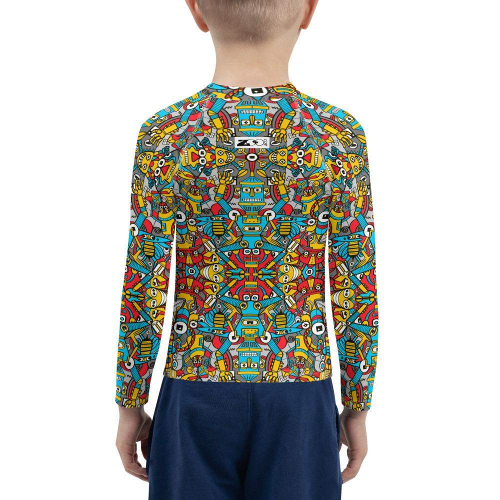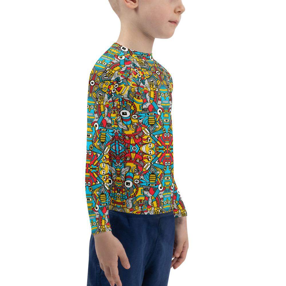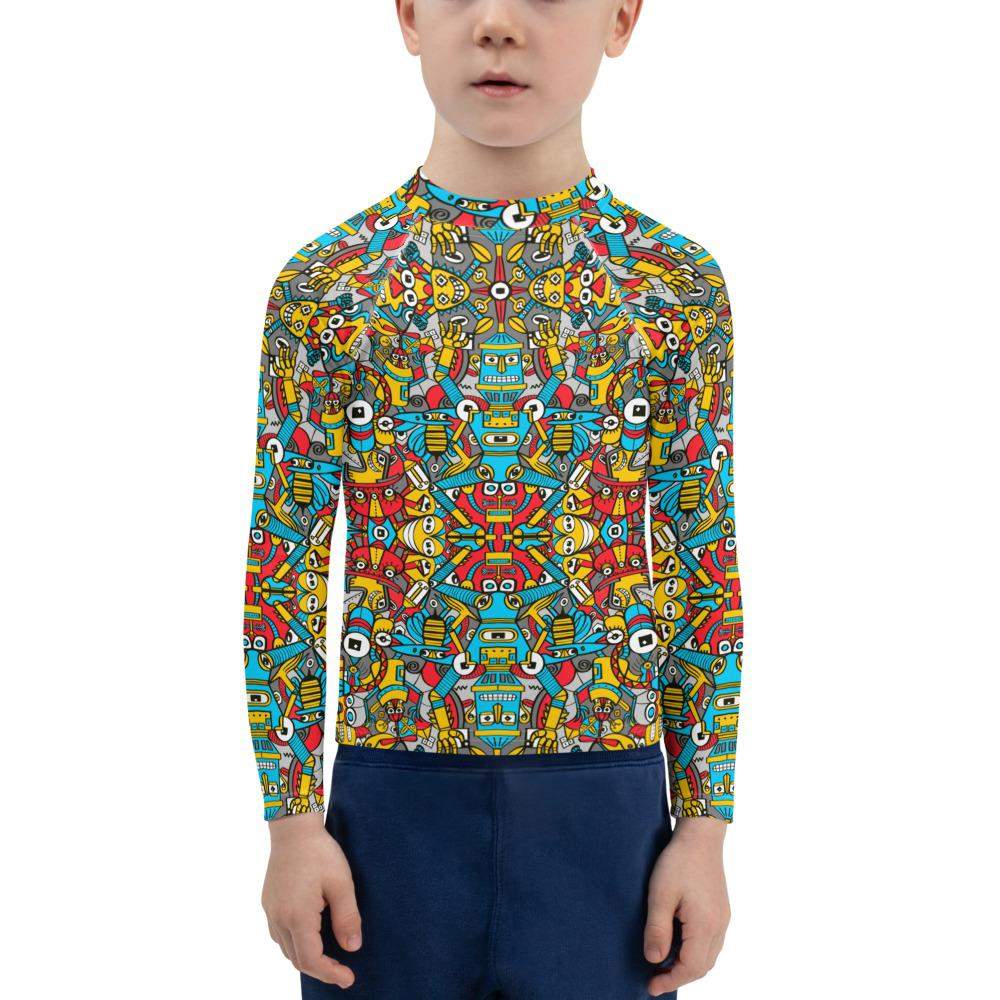 Crazy robots rising from rust in lively junkyards Kids Rash Guard