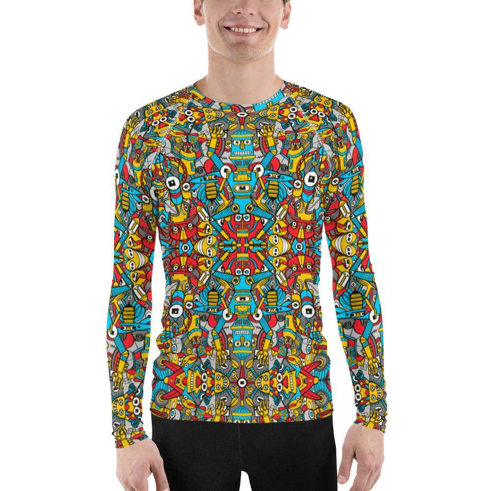 Crazy robots rising from rust in lively junkyards Men's Rash Guard