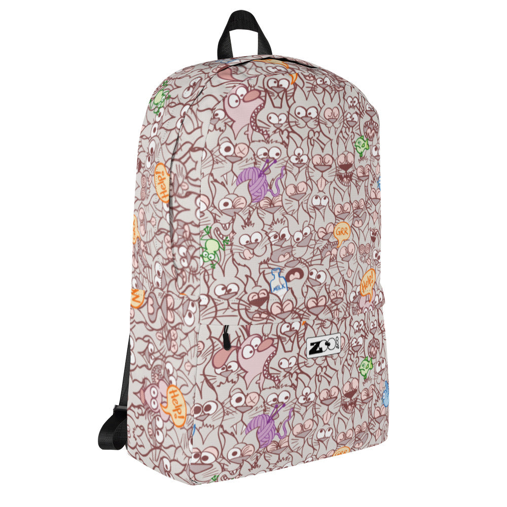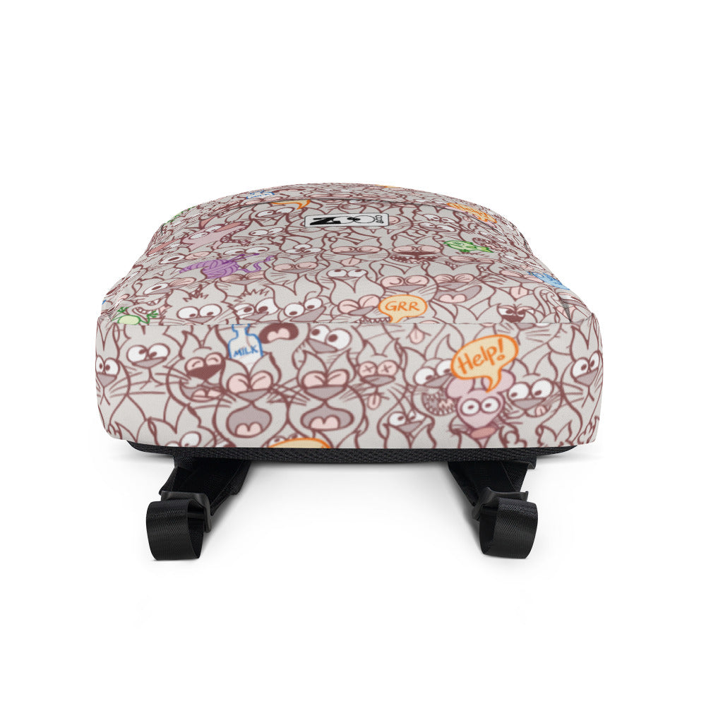 Pattern design filled with cool cats in different expressions and situations. Look at the mouse, the ball of wool, the frog, the bird, the milk bottle, the fish and the fearsome dog.