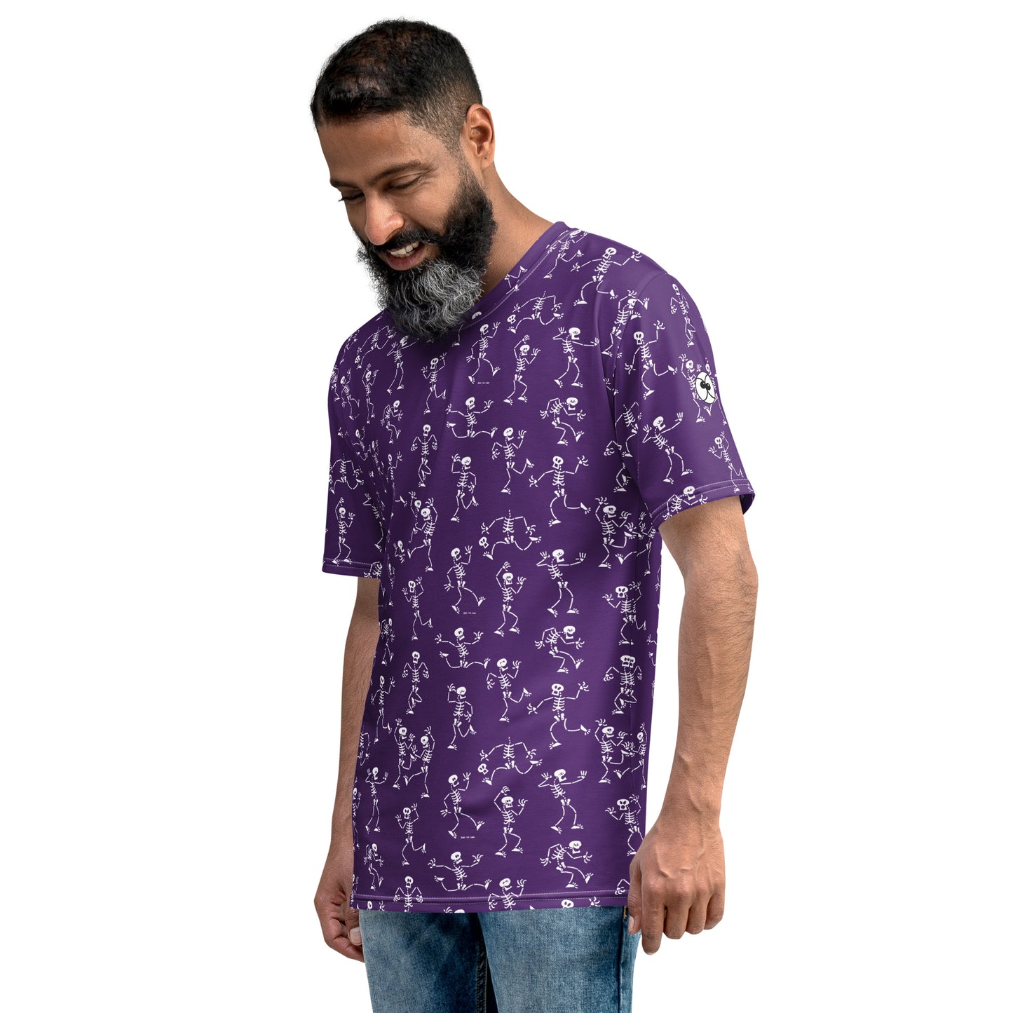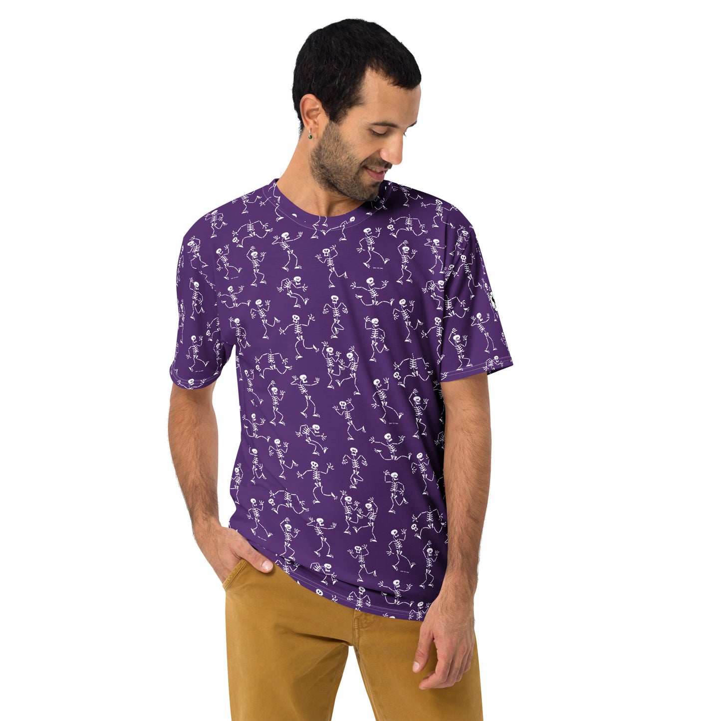 Introducing the spooktacular Halloween Men's T-Shirt that's bound to bring out the ghoul in you! This is a deep and enchanting purple canvas adorned with an ensemble of fantastic white skeletons, each one sporting their unique Halloween spirit. These bony buddies are here to party, and they're taking center stage with their infectious energy!