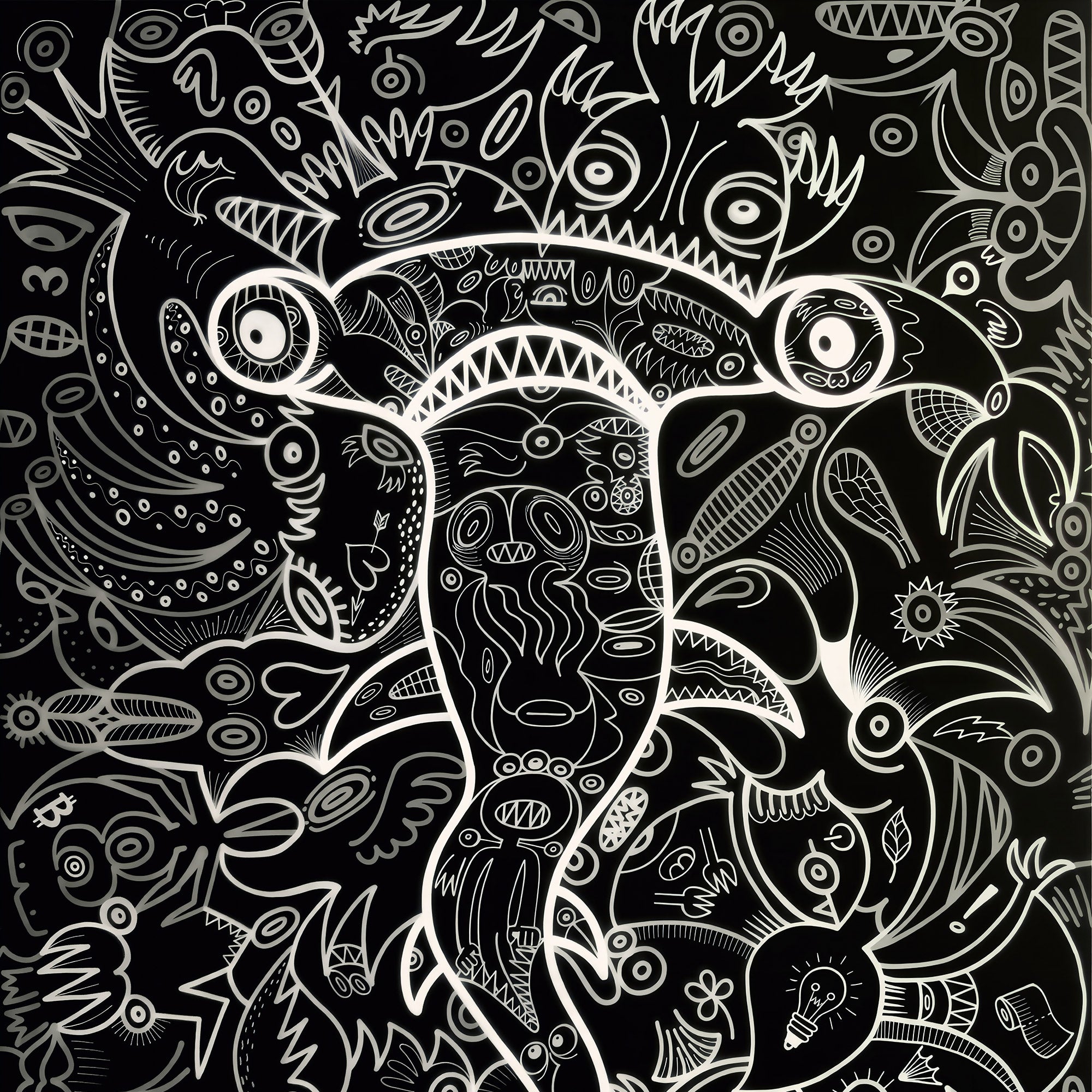 At its core lies a striking hammerhead shark silhouette filled with micro-worlds: hidden characters, swirling lines, optical textures, and overlapping doodle layers. The artwork pulls you in up close and delivers powerful visual impact from a distance.