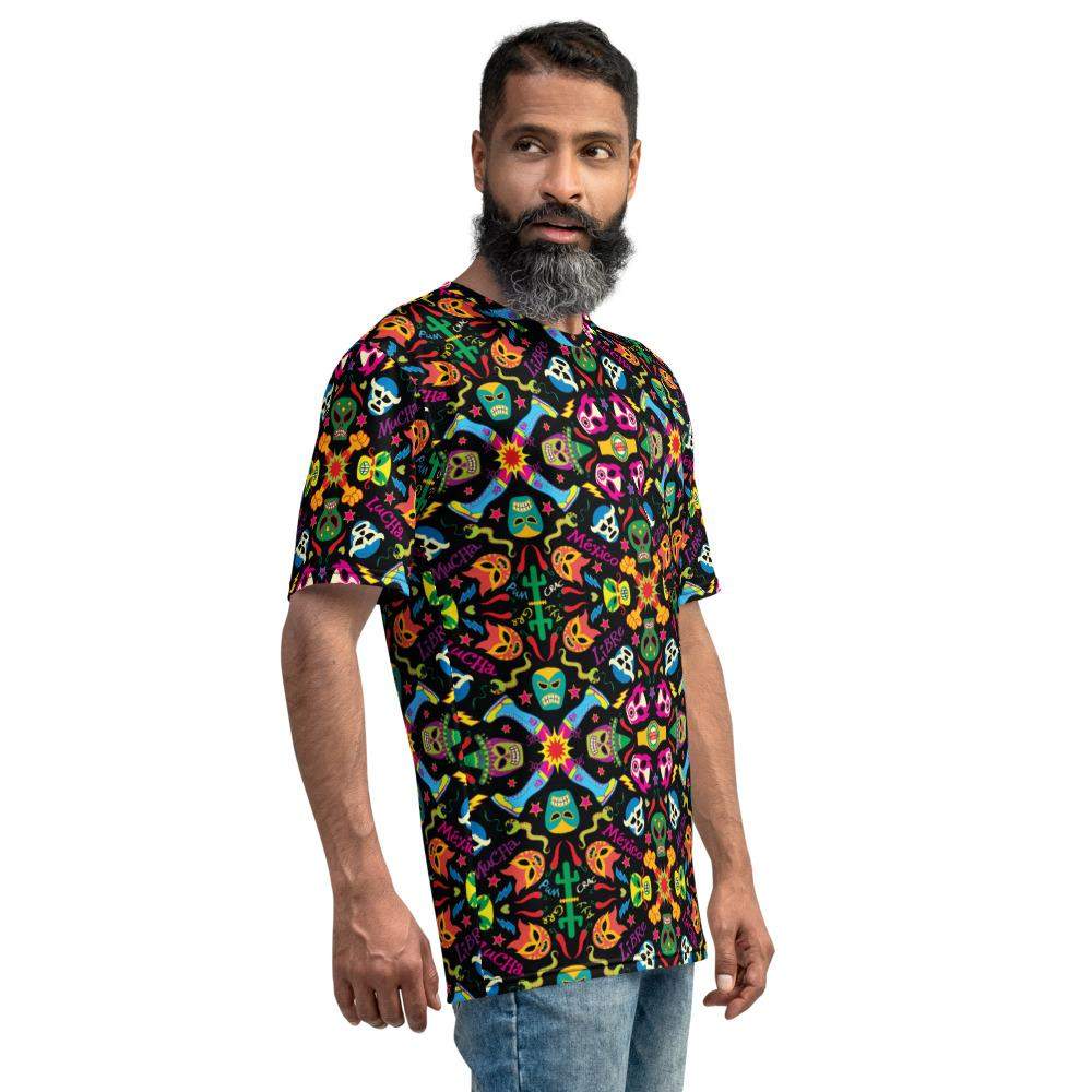 Brave Mexican wrestlers getting ready for the fight of their lives. Colorful pattern design showing wrestlers, masks, snakes, skulls, flowers, cactuses, tequila bottles, hot chili peppers and all the fun, love and spice of this traditional Mexican spectacle. Day of the dead.