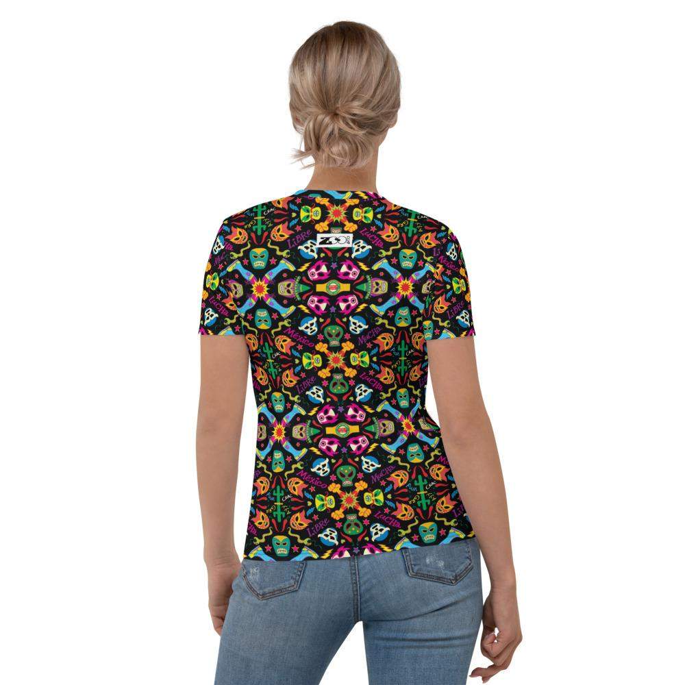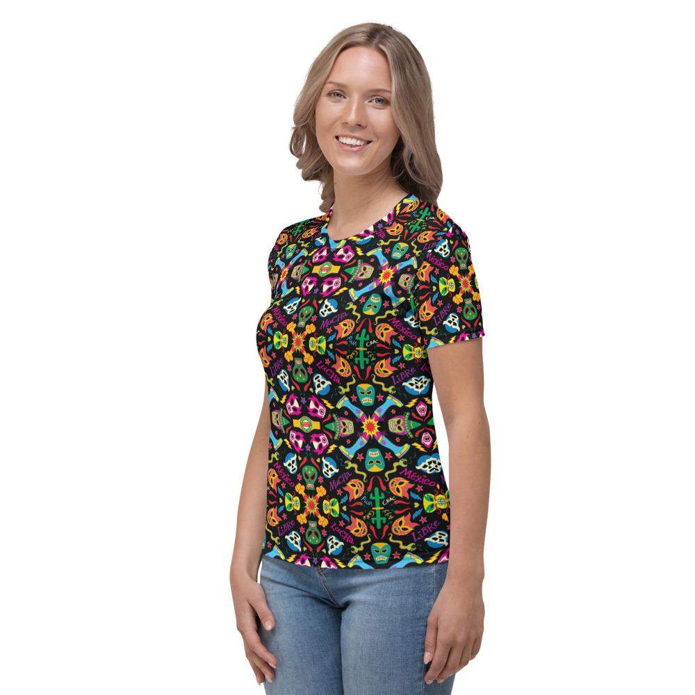 Brave Mexican wrestlers getting ready for the fight of their lives. Colorful pattern design showing wrestlers, masks, snakes, skulls, flowers, cactuses, tequila bottles, hot chili peppers and all the fun, love and spice of this traditional Mexican spectacle. Day of the dead.