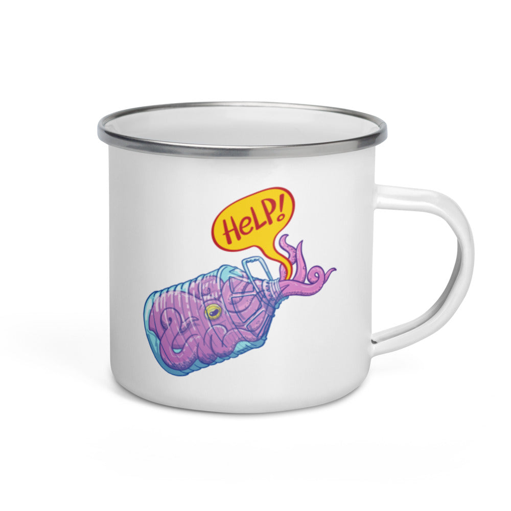 Octopus in trouble asking for help while trapped in a plastic bottle Enamel Mug