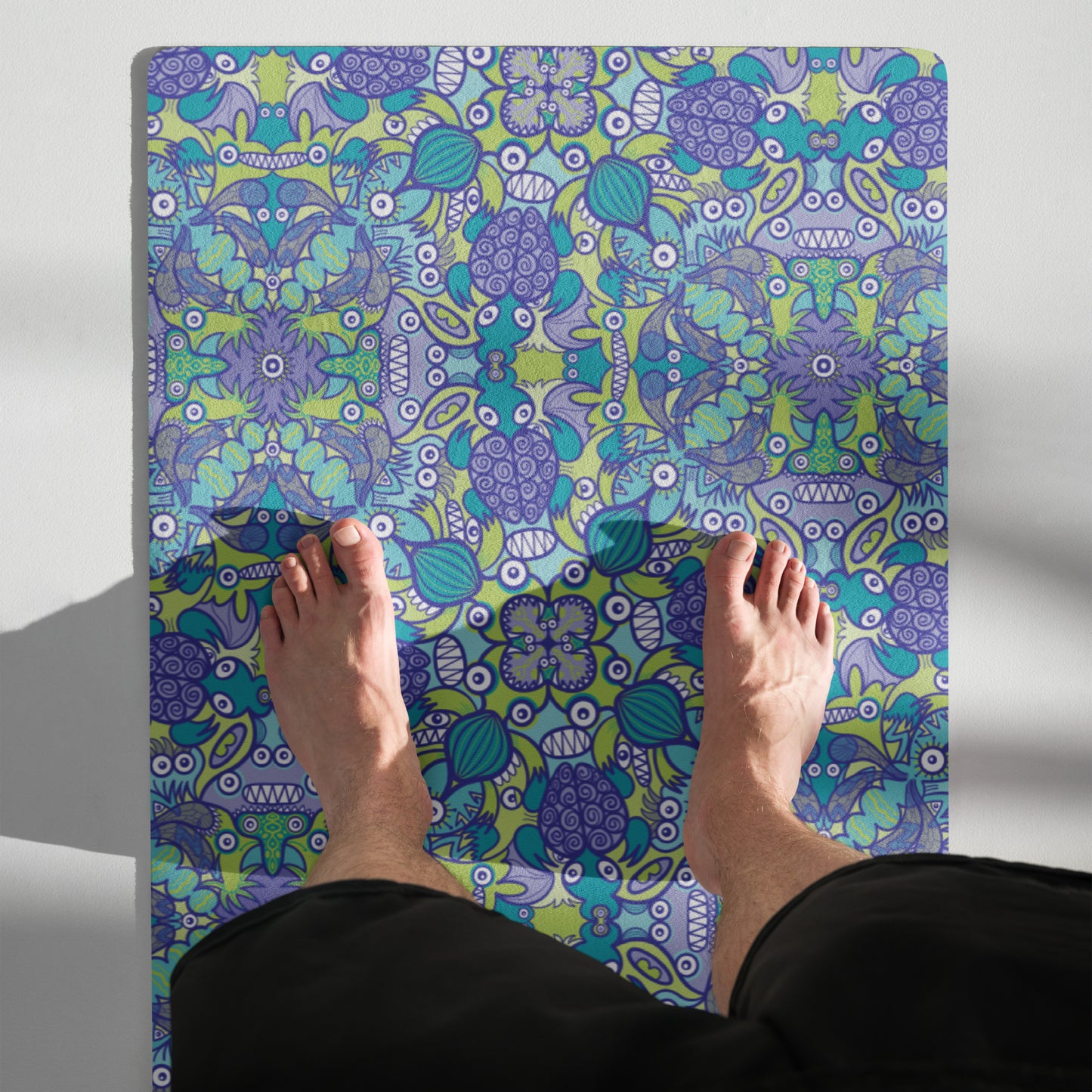 This pattern design features a whimsical and lively depiction of underwater creatures in their natural habitat. It's an all-over print design that looks stunning on yoga mats. The color palette includes shades of turquoise, green, and blue, evoking a sense of calmness, serenity, and surprise.