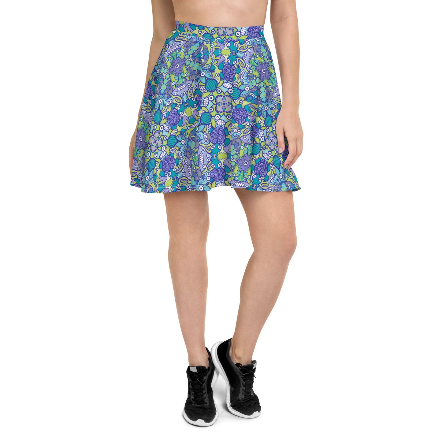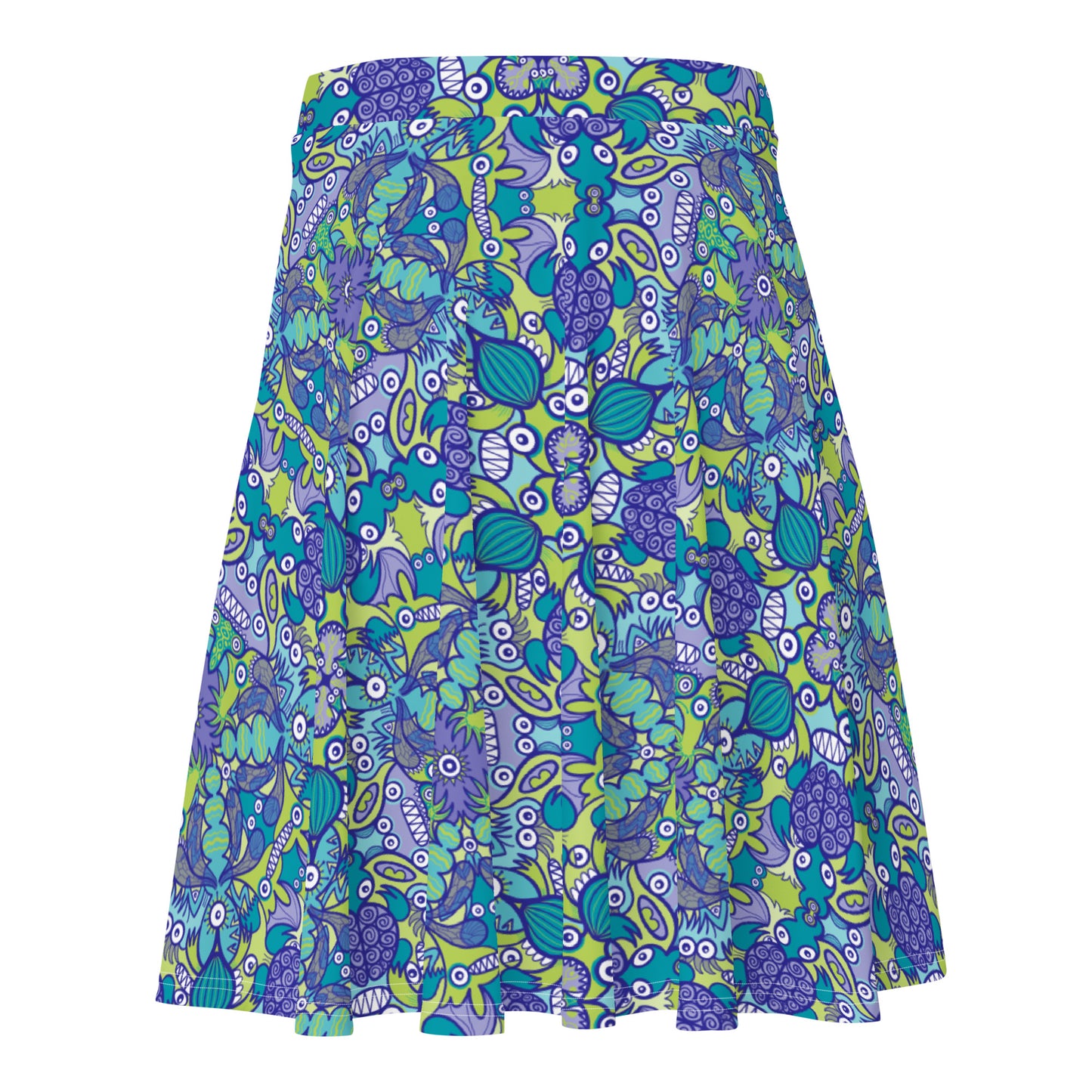 Introducing our "Once upon a time in an ocean full of life" all-over printed skater skirt, a captivating and playful addition to your wardrobe. This mesmerizing design transports you to an underwater paradise where vibrant turtles elegantly swim alongside a host of whimsical aquatic creatures in a dazzling array of turquoise, green, and blue hues.
