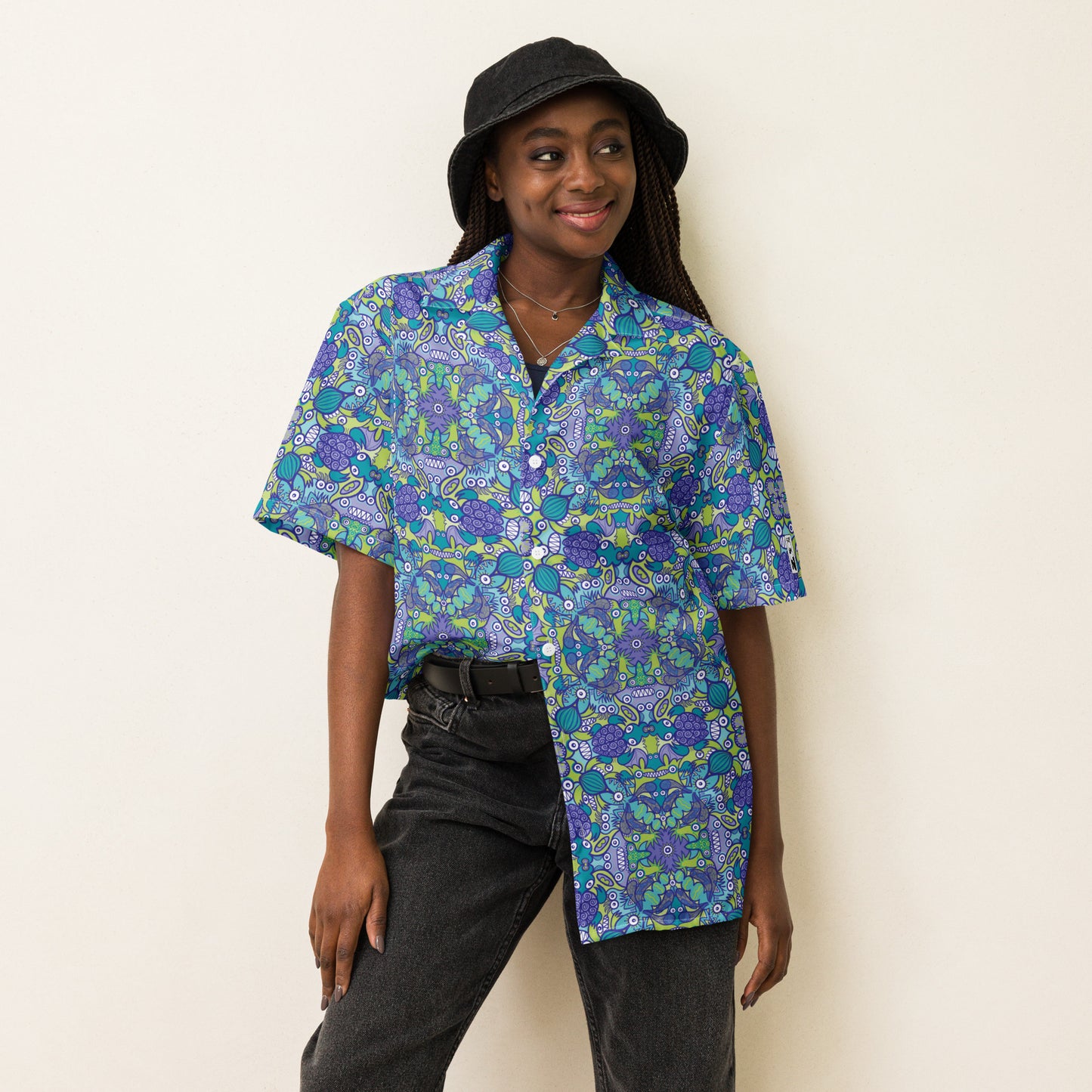 In the heart of this design, graceful turtles glide effortlessly amidst a symphony of aquatic marvels, accompanied by playful insects and whimsical beings. Their intricate details and vibrant hues command attention, infusing joy and life into your attire. This shirt is your gateway to a world of vibrant, aquatic beauty, making it irresistible for both men and women.