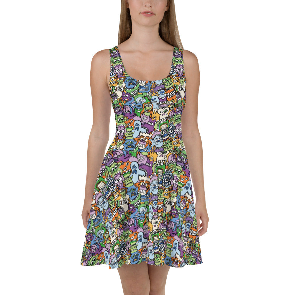 Dare to gather all the spooky Halloween monsters in one single design! Here it is! Find witches, mummies, vampires, werewolves, zombies, ghosts and skeletons in this wacky Halloween pattern. Order it all-over printed on this awesome skater dress and make it your favorite one! Look terrific at that Halloween party!