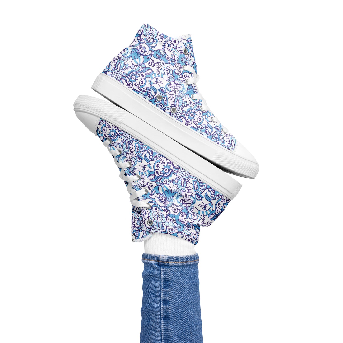 The "Whimsical Blue Doodle Critterscape" design on these canvas shoes is perfect for those seeking a touch of whimsy in their footwear. Let your imagination run wild as you walk, embracing the joy and wonder that this design embodies. Get ready to embark on an adventurous and carefree experience with these stylish and comfortable high top canvas shoes!