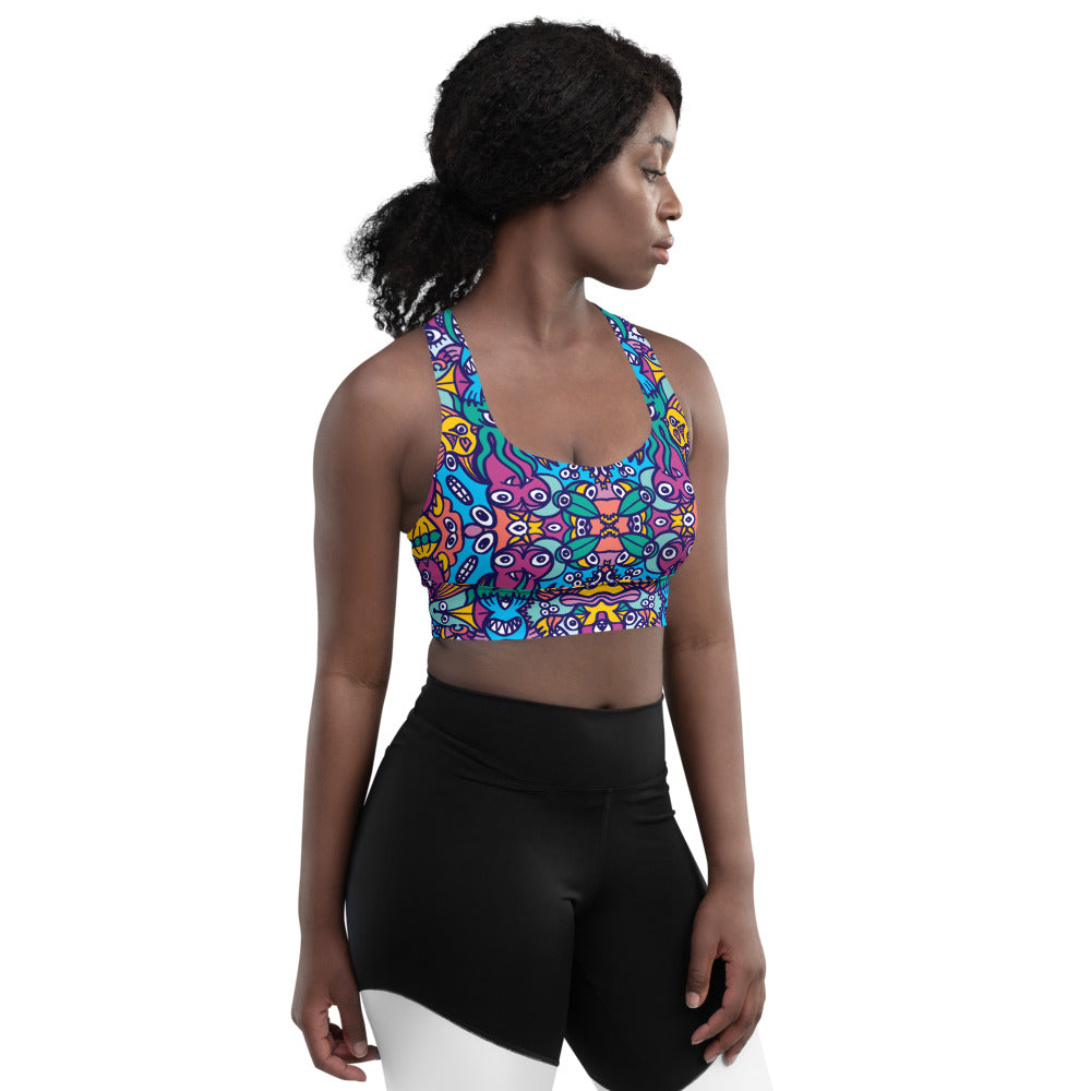 Whimsical design featuring colorful critters from another world Longline sports bra