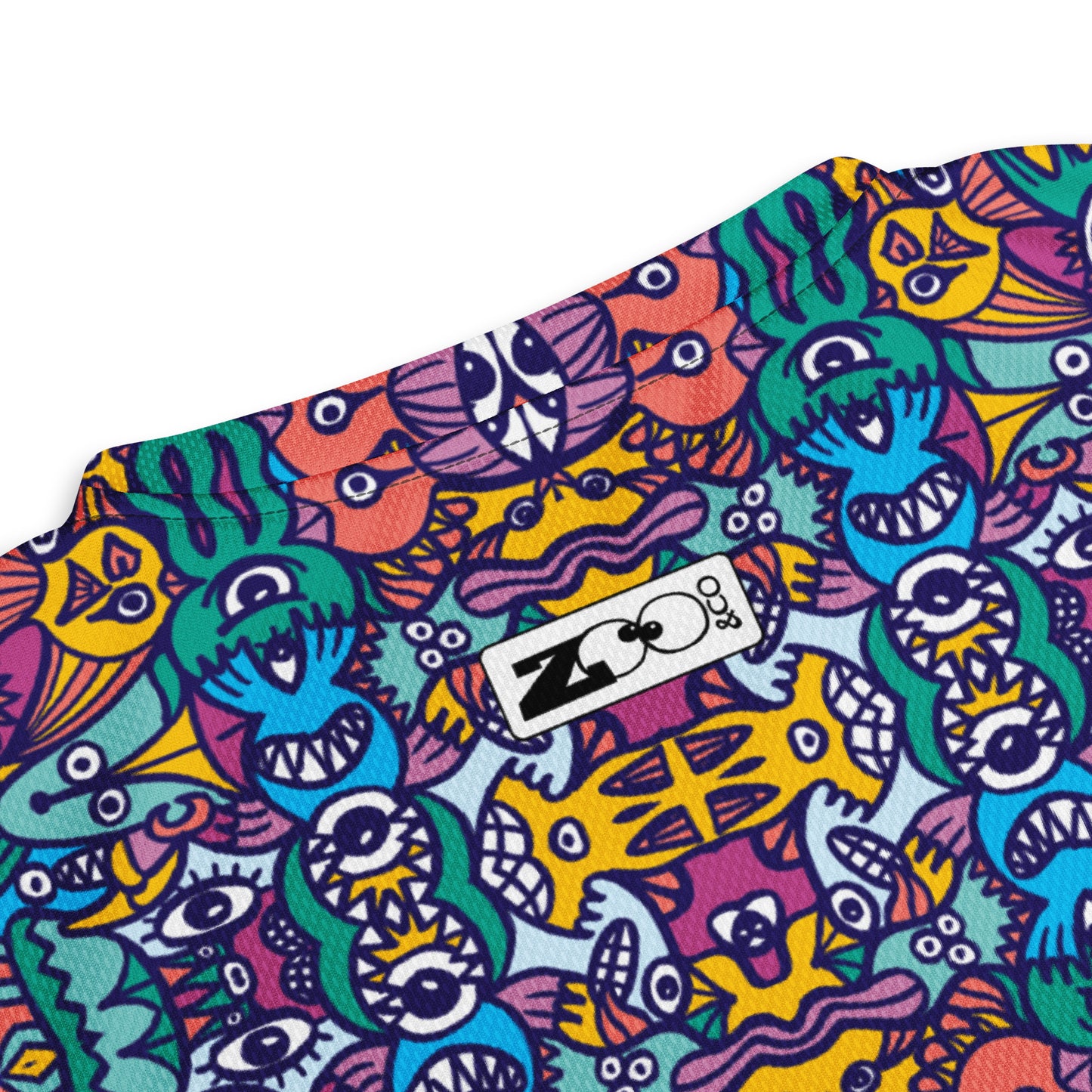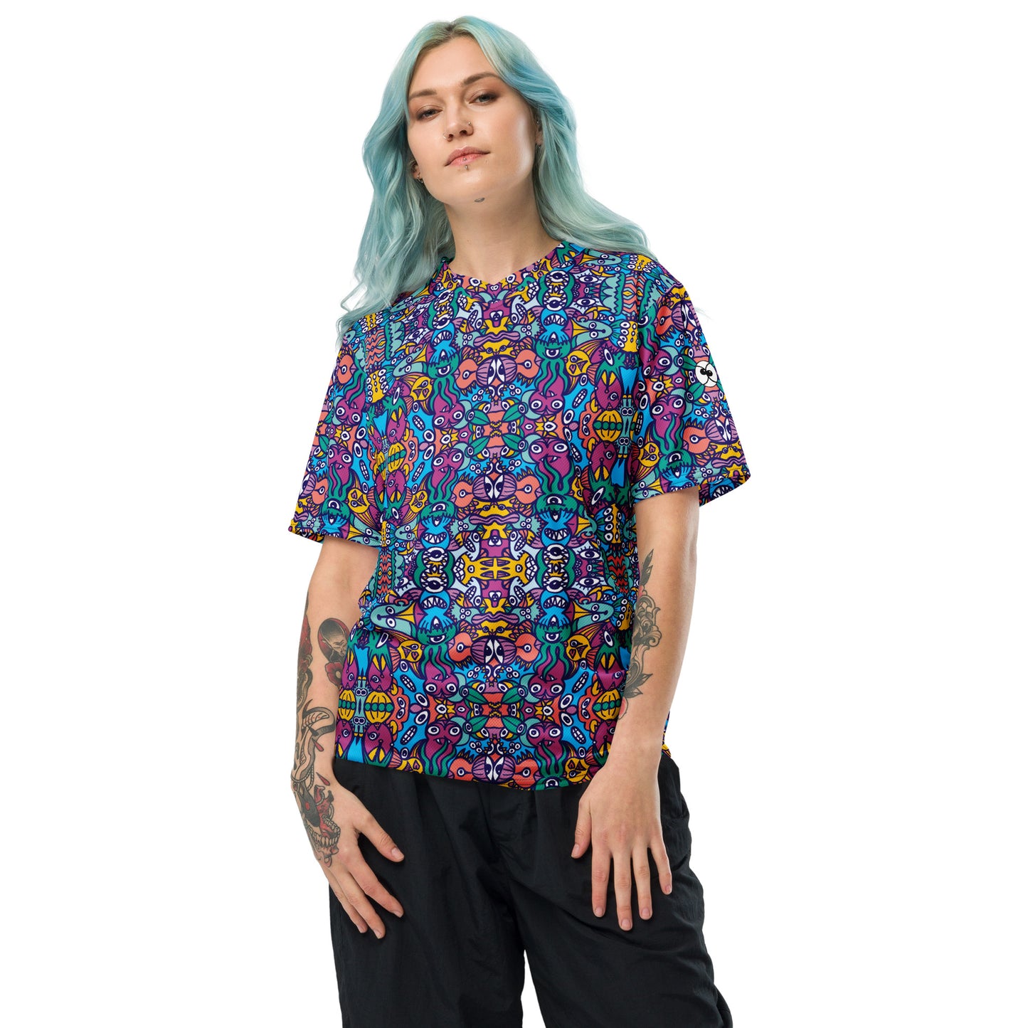 Whimsical design featuring multicolor critters from an alien world Recycled unisex sports jersey