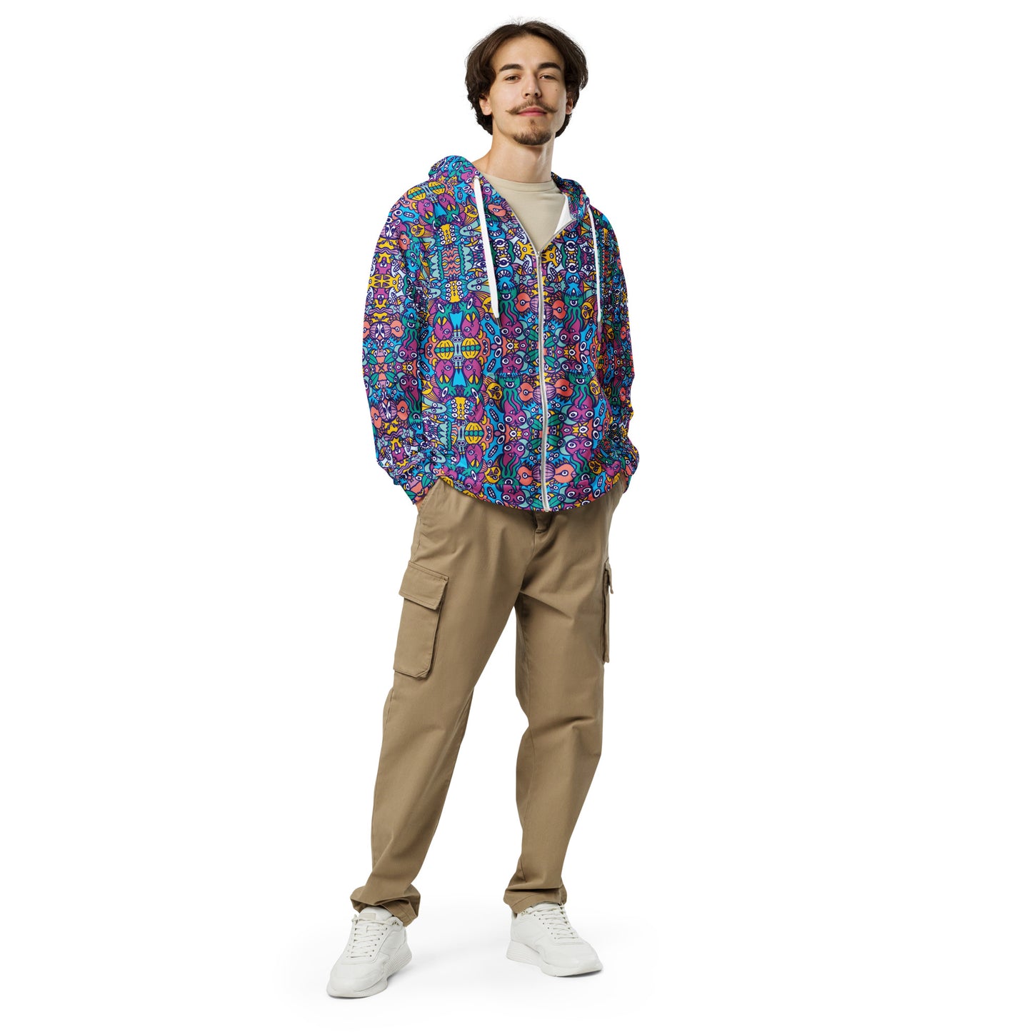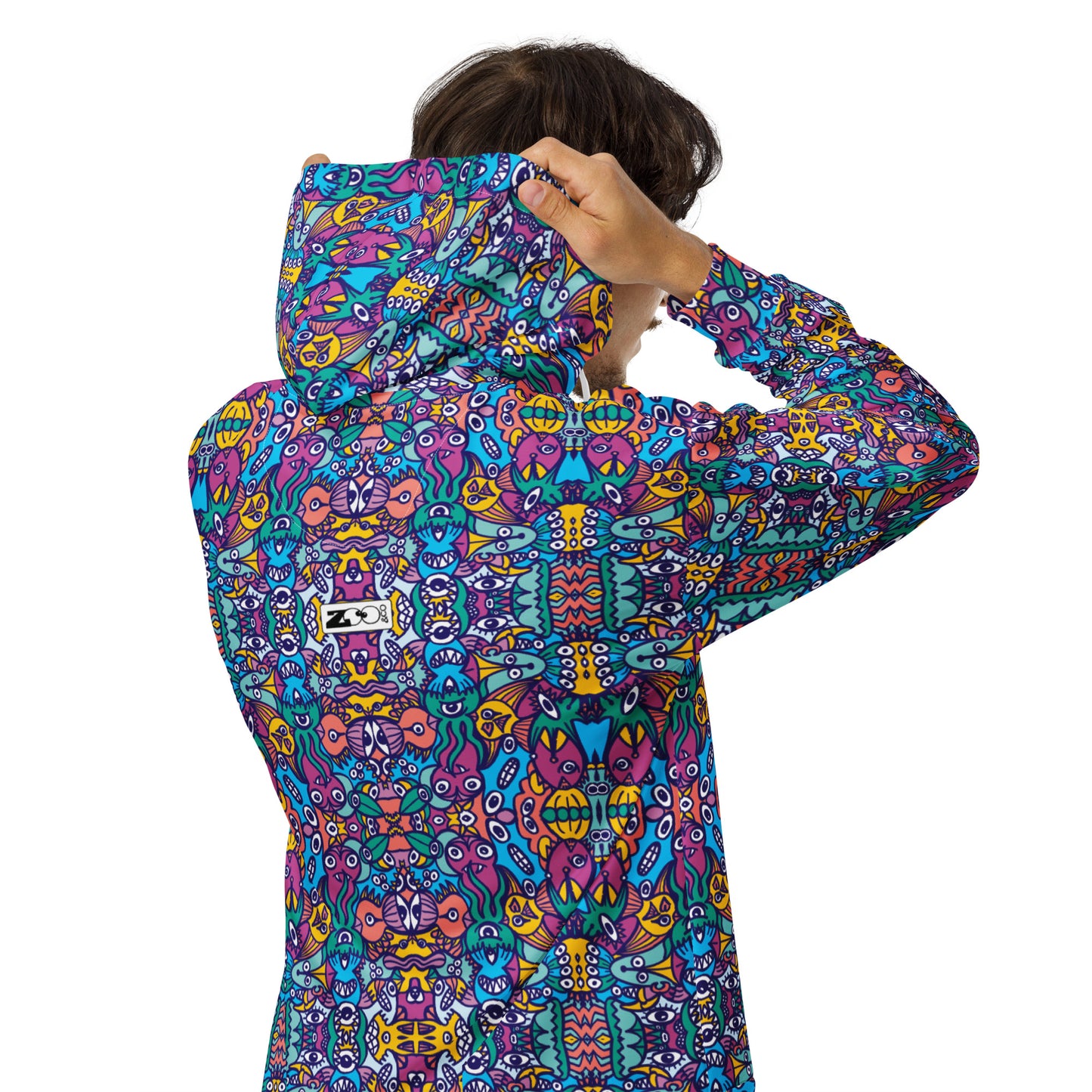 Elevate your wardrobe and accessories with this extraordinary doodle art design all-over printed on this Unisex zip hoodie, the multicolor alien critters pattern is bound to turn heads and spark conversations. Embrace the unconventional and showcase your unique style with a touch of cosmic charm. Don't miss the opportunity to bring this whimsical pattern to life in your fashion collection, let the multicolor alien critters pattern redefine your sense of style.