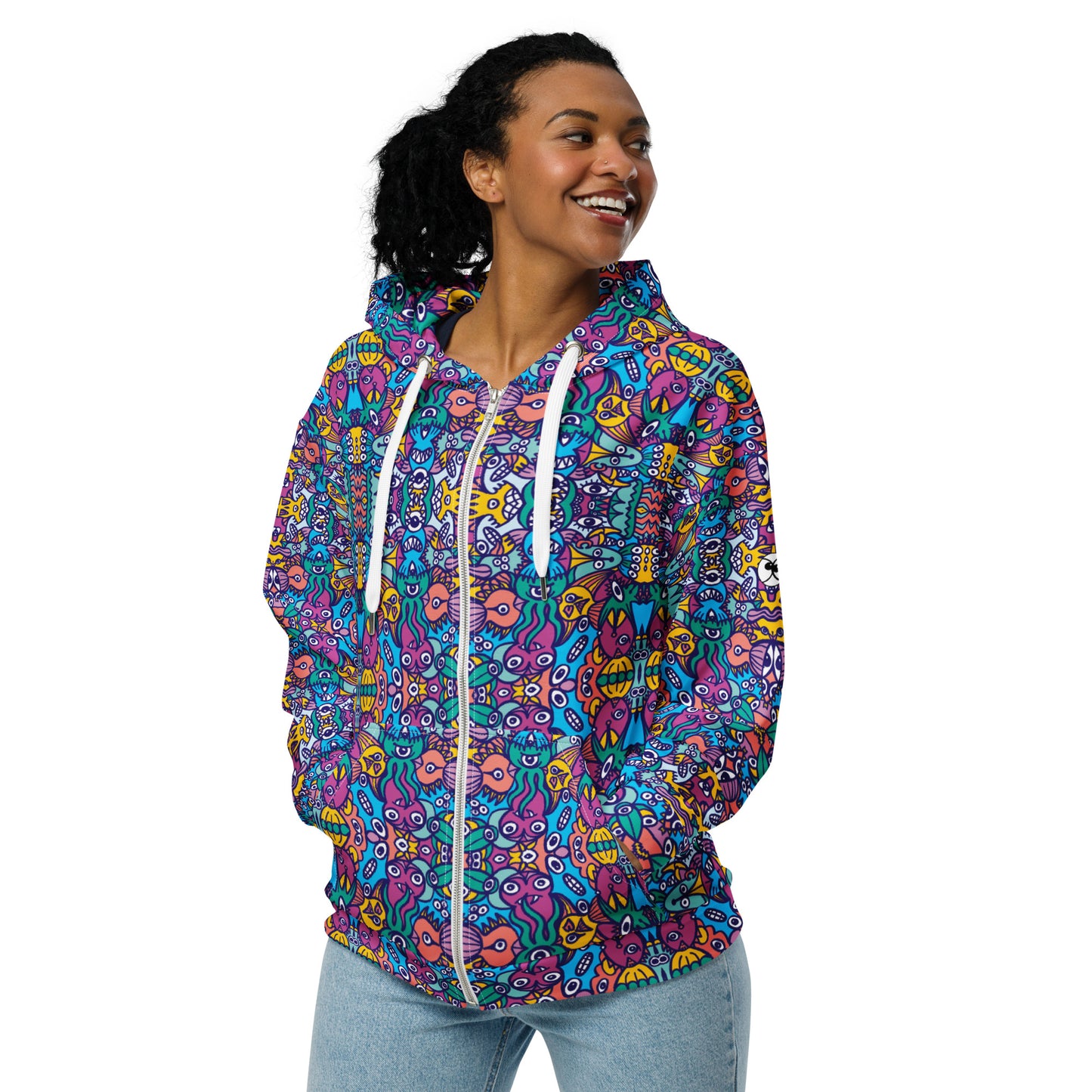 Unleash your imagination and explore the alien world within the confines of this captivating doodle art masterpiece. Meet the zip hoodie—a must-have for everyday wear. Crafted from 95% recycled polyester, it combines sustainability with style. Soft both inside and out, this unisex hoodie offers a relaxed fit with drop shoulders. Plus, it’s designed to last, keeping you cozy and fashionable for years to come.
